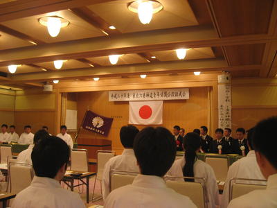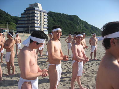 二日振りの更新となってしまいました。本日は19日。当神社「月次祭」を斎行する日でございます。降る降ると言われていた雨も降らず、午前9時より成狐さんを始め、職員一同で無事に御奉仕して参りました。さて、更新を怠っていた二日間。毎年恒例のこちらの研修会に参加しておりました。「平成20年度東北六県神道青年協議会禊錬成会」でございます。年に一度六県持ち回りで、東北各地より青年神職が一同に参集しての研修会。本年は山形県神道青年会の主管で鶴岡市は湯野浜海水浴場で開催されました。快晴にも恵まれ、清々しい禊が始まります。天候に負けじと良い笑顔の当会の瀬川顧問、鈴木、小保内両地区委員でございます。宿泊会場遊水亭「いさごや」からは素晴らしい景色が一望です。見渡す限りの海原です。禊もこの海岸で行われ、穏やかな波に打たれながら身も心も洗われる禊となりました。また、講義では「公益」という観点から現代において社会に求められる神社のあり方を再考する機会とすると言うことで、東北公益文科大学の間瀬教授、加茂水族館の村上館長にお越し頂き、「神社が地域の人々にとって心の拠り所として存在し、機能するように地域の特性に合わせた施策や護持のあり方が求められている」との御講義を賜りました。研修中にはクラゲを始めとして、創意工夫によって再建に成功した「加茂水族館」の視察研修も行われました。世界も注目するクラゲの展示。20数種類のクラゲが展示され、直接クラゲに触れる体験コーナーもありました。様々な講義、視察を通し各奉仕神社にとって氏子の皆様の心を引きつける為の有意義な研修になったことと思います。少々お疲れのようですが、本年度の開催県「山形県神道青年会」本多様を始め会員の皆様です。今回の2日間に亘る準備、進行お疲れ様でした。またお会い出来る日を楽しみにしております。