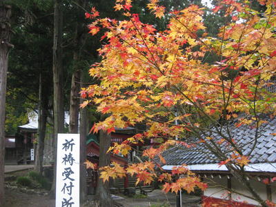 稲荷山の紅葉。正面のモミジも漸く色付き始めました。上部の方から段々と。まだまだ緑の部分が多いのですが、これから寒さを増すにつれて赤みが増して参ります。これに対して、社務所脇のモミジは色付きが早いようで…3割程すでに真っ赤に染まっております。このまま行けば数日で見事な紅葉が見られそうです。ここ数日は朝晩の冷え込みも緩んでおりますが、余裕を持っているとあっと言う間に厳しい寒さがやって参ります。その寒さに備えて、境内の杉も衣替え。オレンジの葉に包まれて、どの杉よりも温かそうです。10月も中旬。寒暖の差が激しくなるこの季節。皆様にも体長を崩されることなく、穏やかな秋をお過ごし頂きますよう御祈念申し上げます。さて、本日も「七五三スタイル」をお届け致します。元気なポーズと共に御参拝された「稜翔くん」。しっかり自分で絵馬に願い事を書かれておりました。その願い事が叶うように、これからも元気一杯明るく過ごして下さいね。赤い着物に桜の花飾りがお似合いの「紗羅さん」。本当に素敵な笑顔で、こちらまで明るい気持ちにさせてくれます。七五三詣り。御家族の皆様には、無事に七五三詣を迎えられました事心よりお慶び申し上げます。神様は目には見えないですが、必ず皆さんを見守ってくれています。「ありがとう」の感謝の気持ちを忘れず、これからも夢に向かって一生懸命頑張って下さい。