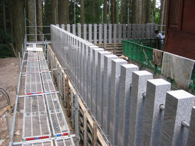 昨日までの雨も上がり、稲荷山に眩しい太陽が戻って参りました。それでも日中は気温も25度前後と、昨日に比べると幾分過ごしやすい天候となりました。雨により土砂崩れ等の被害も出たとの事ですが、皆様の地域は如何でしたでしょうか?震災後と言うこともあり、地盤の緩みも予想されます。梅雨時期と言うこともあり、今後も充分に御注意頂きますようお願い申し上げます。晴れ間が戻ったと言うこともあり、この方は早速境内へ向かわれました。急斜面の草刈りへ。濡れた草はどうしても滑りやすくなってしまいます。足場だけには御注意の上作業願います。こちらも天候に恵まれ急ピッチで作業が進んでおります。本日の「現場報告」でございます。第3コーナーを曲がり、最後の長い直線へと取り掛かっております。北側から東側。見事な直線が描かれております。その基礎が揺らぐことなく末永く建ち栄えることを祈るばかりです。稲荷山を降りるとこの方にお会いしました。「稲荷のわんこ」ジミーさんです。散歩中でございます。少し歩きすぎたのか、お疲れの御様子。暑い中での散歩は体力を消耗致します。帰られた際は水分をしっかり補給され、ゆっくりお休み下さい。