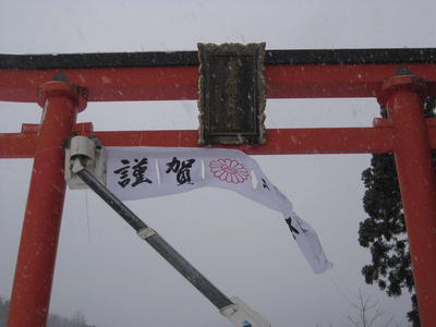 稲荷日誌の更新を3日間も怠っている内に今年も残すは明日を含め4日となってしまいました…この慌ただしい中で、少しでも安らぎをと更新しなければと思っていたのですが、更新せず誠に申し訳ございません。平成23年。今後も最後まで稲荷山の日々をお伝えして参りますので、何卒変わらぬ御高覧の程宜しくお願い致します。そんな更新を怠っている内に。稲荷山はお正月の準備が着々と進んでおります。恒例の大鳥居「謹賀新年横断幕」が設置されました。今年は震災も有り、掲げることを控えようと思っていたのですが、新年を迎えるにあたり、心新たに来る年が皆様にとって素晴らしいものとなるようとの願いを込め、今年も変わらず設置させて頂きました。いつも大神様は側で見守ってくれております。いつも変わらず、そしていつまでも。その恩恵に感謝をし、年の初めには新年の願いを込め、家族揃って氏神様に御参拝致しましょう。さて、そんな横断幕ですが、今年は設置に苦労致しました…いつもお世話になっている「小田中電気」様の高所作業車に出動頂きました。ここまでは良かったのですが、天候は吹雪。風に雪に一時横断幕が飛ばされそうになる程。半分ずつ取り付けます。猛吹雪の中、小田中社長、成狐さんの作業により無事に設置されました。そんな作業の下で…「九号」が作業を見守っておりました。何とか無事に取り付けを終わり、九号もホッと胸を撫で下ろしております。是非皆様も御参拝の際はこの大鳥居をくぐり、更に新年が佳き一年となりますよう当神社に御参拝頂ければ幸いです。初詣を控え、本日からはこちらで当神社のCMが放送されております。毎年恒例の「エフエム岩手」様に御協力を賜り放送致しております。このステッカーは毎週火曜日の午後3時より放送されておりますふるさと元気隊として開局された「紫波こびるFM」様のステッカー。銭形平次の女の子版「こびるちゃん」が杜氏さんに扮したり、紫波町の季節の果物を手に紫波町を元気に宣伝しております。御連絡が遅くなってしまいましたが、本日の放送で当神社の特集を組んで頂き、無事に終了致しました。もし、お聞きの方がいらっしゃいましたら御感想などをお聞かせ頂ければ幸いです。。名前にある「こびる」とは方言で「小昼」と書いたり、おやつや一服、休憩と言った様々な意味がございます。お昼前の腹ごしらえと言った所でしょうか。「紫波こびるFM」様は皆様に元気をお届けする為、楽しく賑やかに紫波町の情報を発信しておりますので、皆様も機会がありましたら是非お聞き頂きますよう重ねてお願い申し上げます。