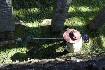 境内にてしめじが増殖中です。今後の事も考え残しておいたら私の足と比較すると解るように、巨大に。こちらの茸の名前は、不明戸川さんは、本日も朝より草刈り外祭より帰社途中の一コマ